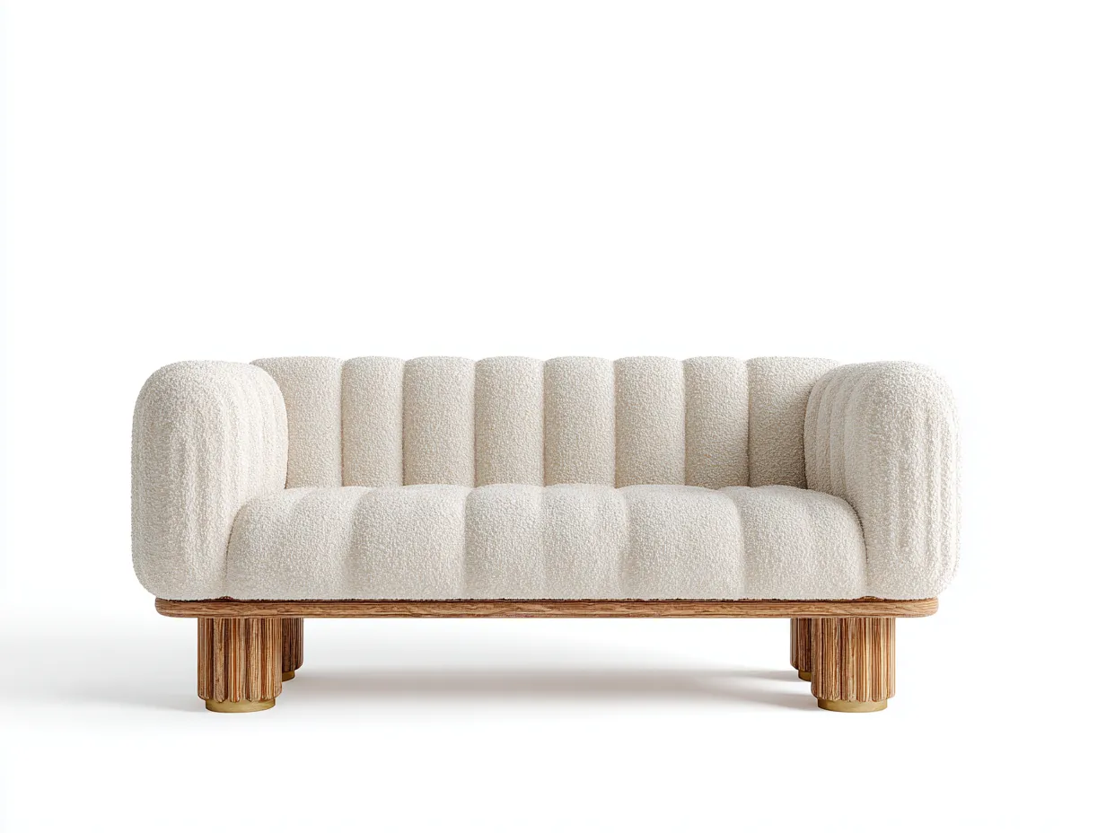 The sofa is upholstered in a cream fabric with a textured surface that adds warmth and visual depth. The base and legs are crafted from solid wood with a natural finish, providing stable support and suitability for long-term indoor use.