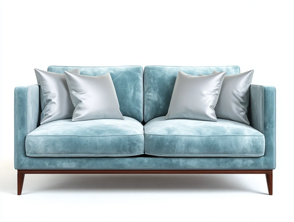 The sofa is upholstered in smooth fabric with a light blue finish and supported by a sturdy internal frame. Precise stitching and a neatly finished base ensure durability and a refined appearance for everyday use.