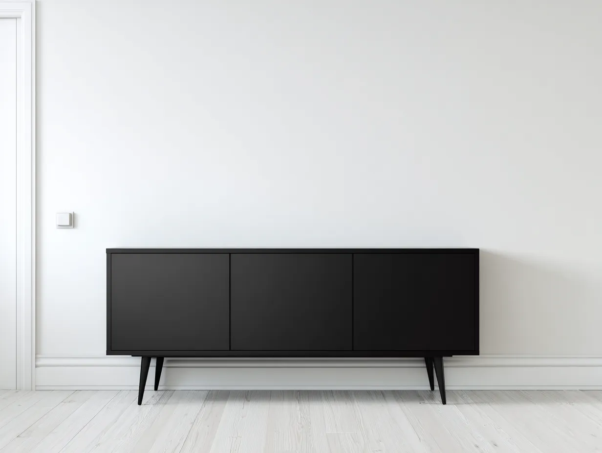 The cabinet is made from engineered wood with a smooth black finish. The surface is evenly treated for a refined look, and the structure is supported by angled legs that enhance overall stability.