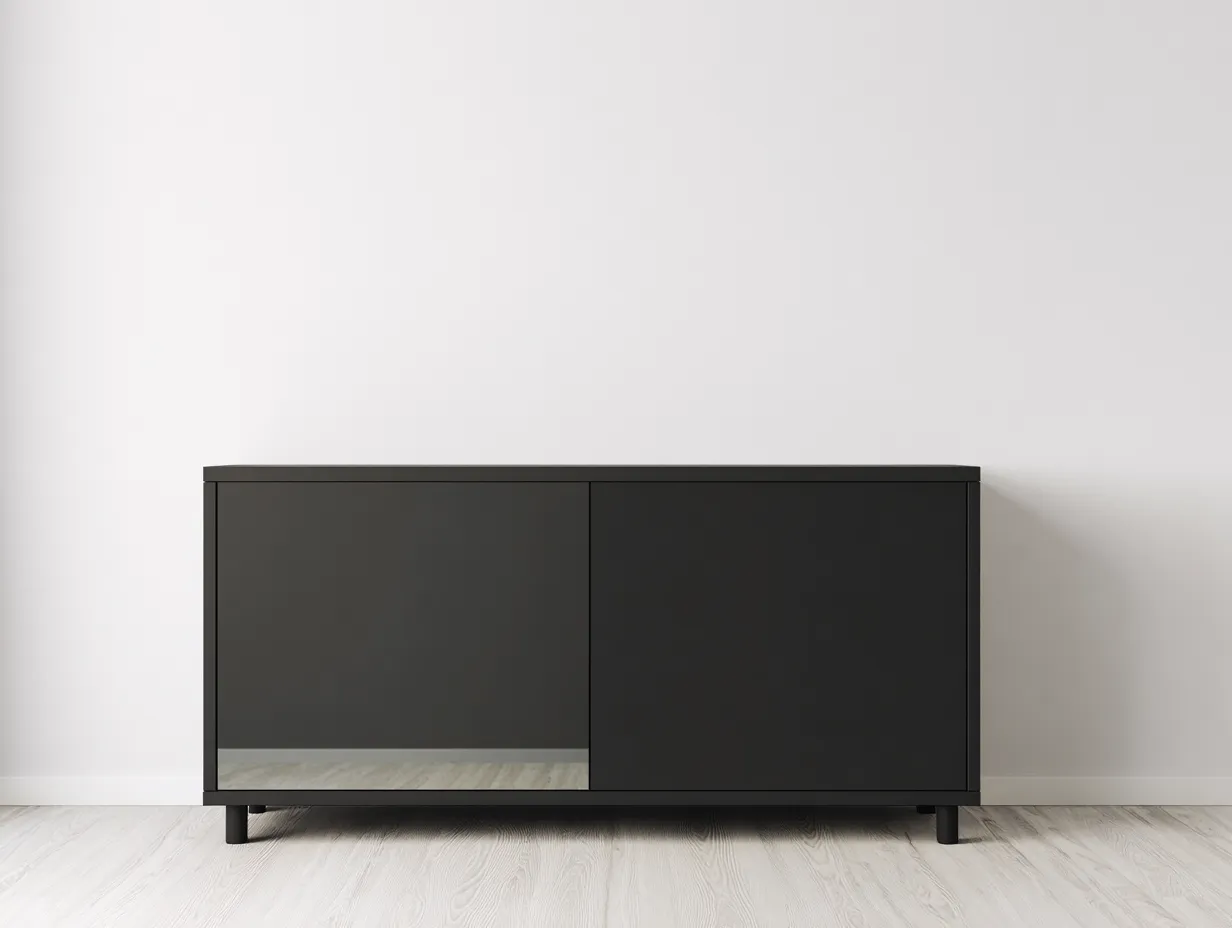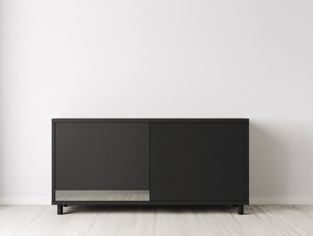 The cabinet is constructed from engineered wood with a smooth black finish. The surface is easy to maintain and designed for long-term indoor use, while the stable base supports everyday storage needs.