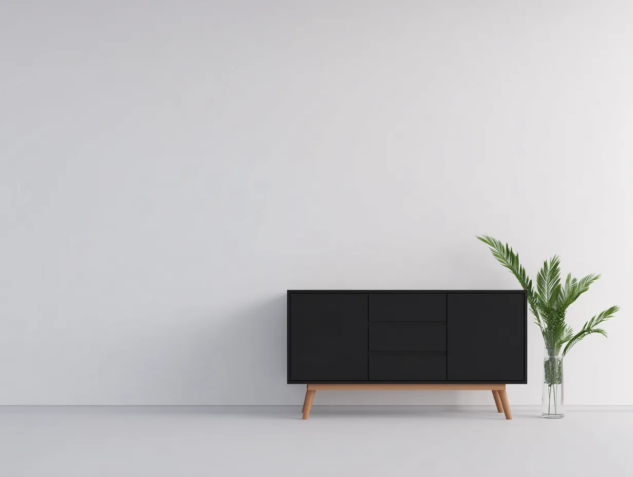 The cabinet is crafted from engineered wood with a black matte finish, paired with solid wood legs in a brown tone. The smooth surfaces and stable structure are suitable for long-term indoor use.